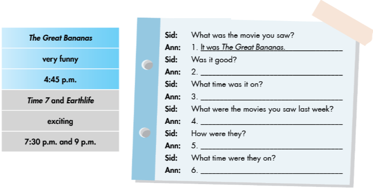 New Words a. Fill in the blanks with the opposite adjectives. Listen and repeat. b. Talk about kinds of movies you like and don’t like using the adjectives. Reading a. Tina wrote two movie reviews for her blog. Underline the correct final sentences. b. Now, read the reviews again and answer the questions. Grammar a. Listen and repeat. b. Circle the correct verbs. c. Look at the table and complete the dialogue. d. Now, practice the conversation with your partner.