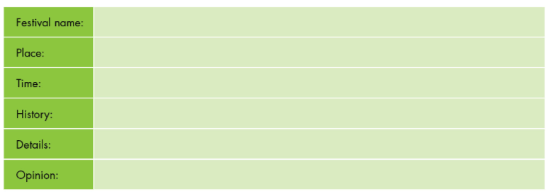 Make notes about an important festival in your country.