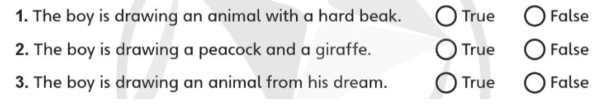 1. The boy is drawing an animal with a hard beak. (Bạn nam đang vẽ một con vật có mỏ cứng.)