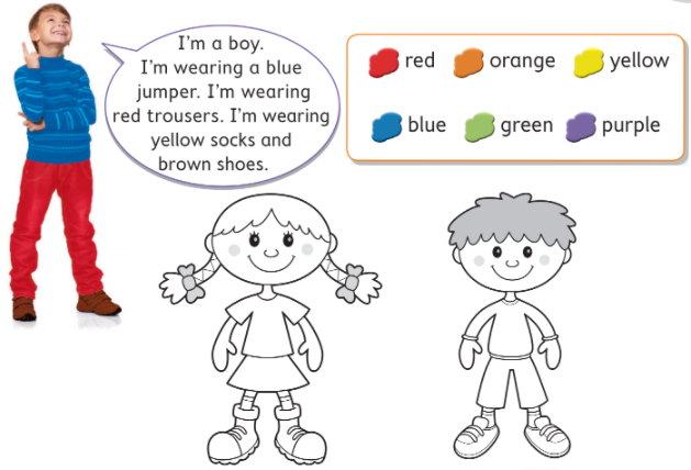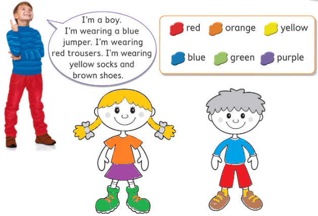 I’m a boy. I’m wearing a blue jumper. I’m wearing red trousers. I’m wearing yellow socks and brown shoes.