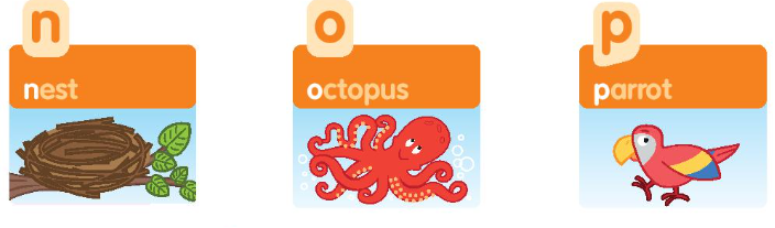 Listen, point, and repeat. Listen and chant. Read the chant again. Say the words with n, o, and p. Write. Listen and complete the words.