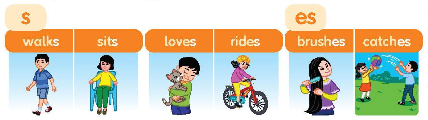 Listen, point, and repeat. Listen and chant. Read the chant again. Underline the words that end with s and es. Then say. Listen and complete the words with s or es.