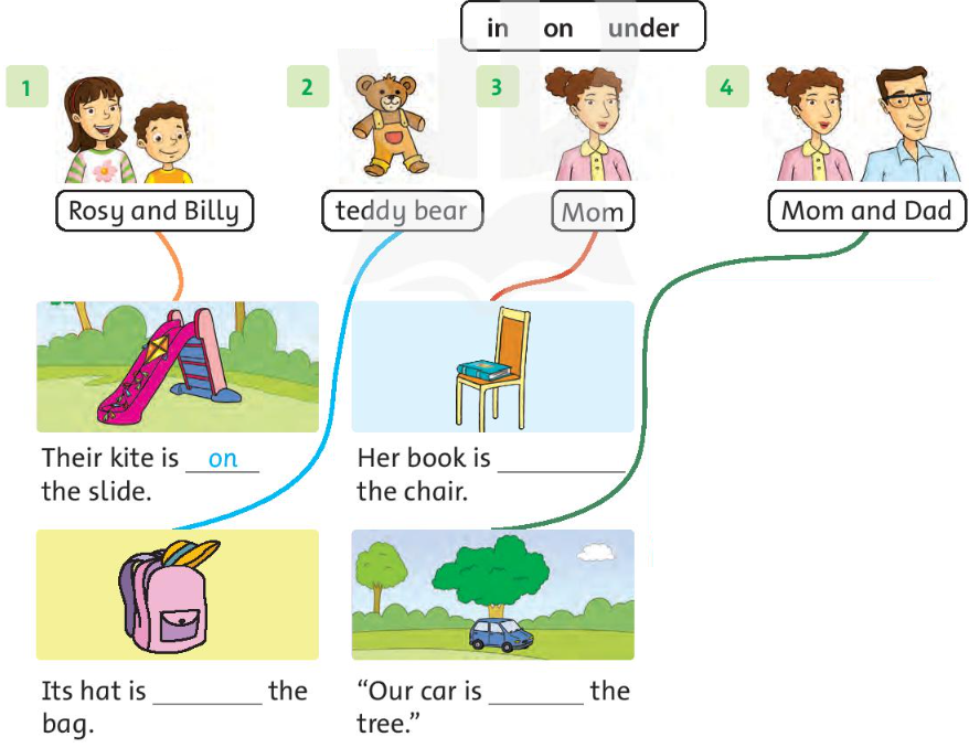 3. Her book is on the chair. (Quyển sách của cô ấy ở trên cái ghế.)
