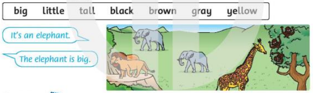 1. A: It’s an elephant. It’s gray. (Nó là 1 con voi. Nó màu xám.)