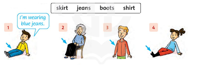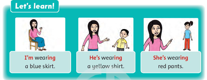 I’m wearing a blue skirt.              (Tôi đang mặc chân váy xanh.)