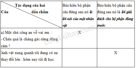 Đánh dấu X vào ô thích hợp xác định tác dụng của du hai chấm trong mỗi câu dưới đây :