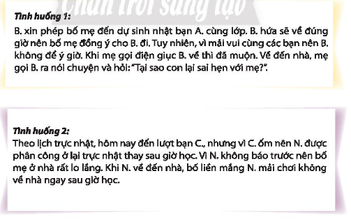 + Tình huống 2: N giải thích rõ nguyên nhân mình về muộn, đồng thời xin lỗi bố mẹ vì đã không gọi điện thoại báo cho gia đình. N. giải thích với bố mẹ một cách lễ phép, từ tốn, tôn trọng bố mẹ.