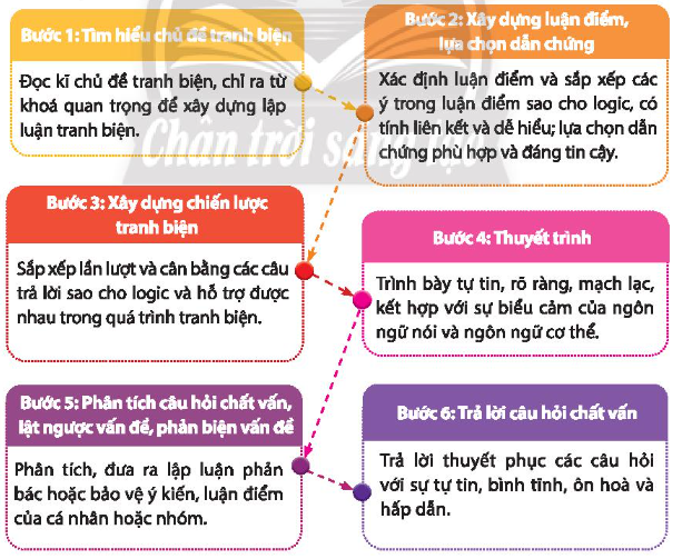 + Bước 6: Trả lời các câu hỏi chất vấn: trả lời rõ ràng, rành mạch, kết hợp với việc bảo vệ vấn đề mà mình đang tranh biện.
