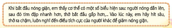 – Khi bắt đầu nóng giận, em sẽ nhận thấy: người nóng lên, tim đập nhanh hơn, thở bắt đầy gấp hơn,…