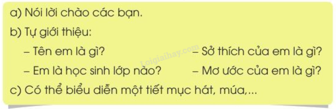 Câu 2: Giả sử em được mời lên sân khấu giao lưu với các bạn trong trường, em hãy tự giới thiệu về mình.