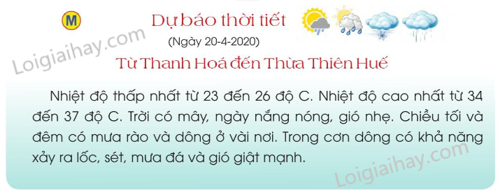 Em nghe một bản tin dự báo thời tiết hoặc dựa vào bản tin dự báo trong sách để trả lời câu hỏi.