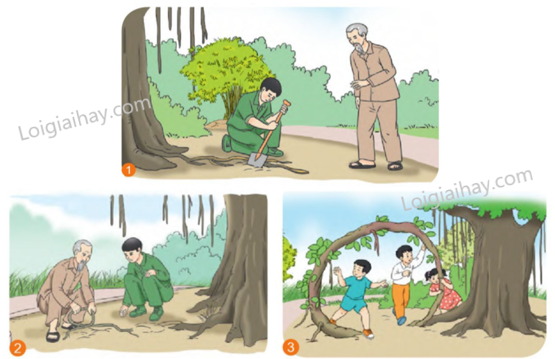 Dựa vào tranh, kể lại từng đoạn câu chuyện Chiếc rễ đa tròn.