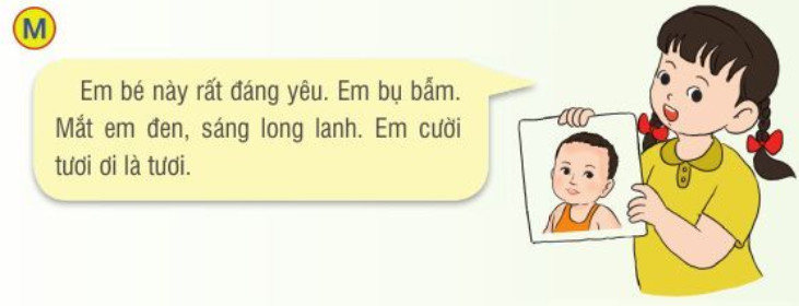 – Em bé này thật đáng yêu. Em có khuôn mặt tròn tròn, bầu bĩnh. Mái tóc được chia làm hai nửa buộc lại gọn gàng. Đôi mắt to tròn và đen láy. Miệng nhỏ xinh chúm chím. Nước da trắng hồng vừa nhìn đã thấy yêu.