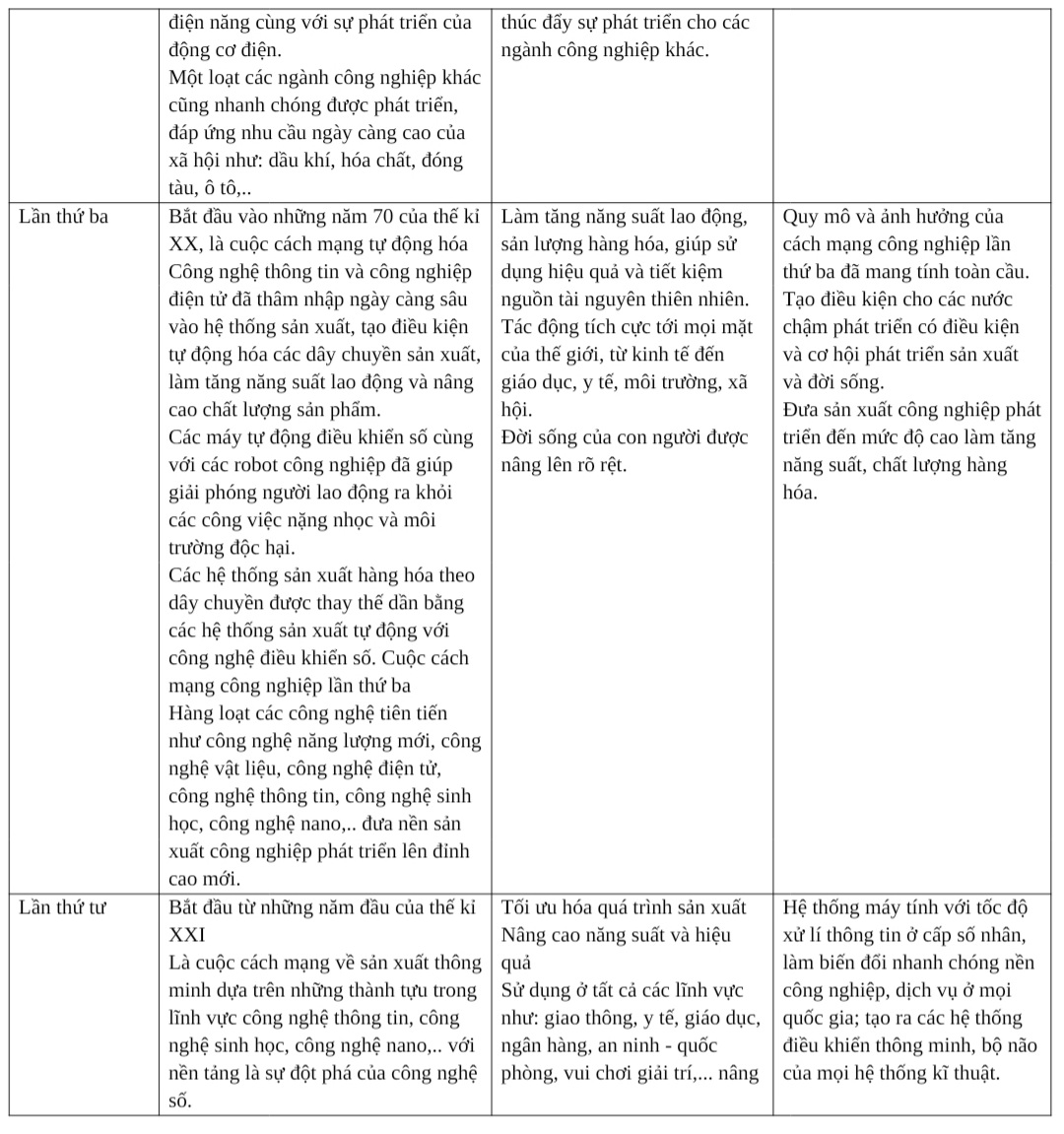 1. Nêu nội dung cơ bản và vai trò, đặc điểm của các cuộc cách mạng công nghiệp