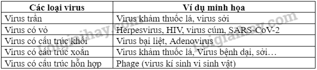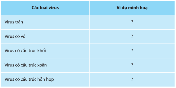 Tìm ví dụ minh hoạ cho các loại virus theo nội dung bảng sau:
