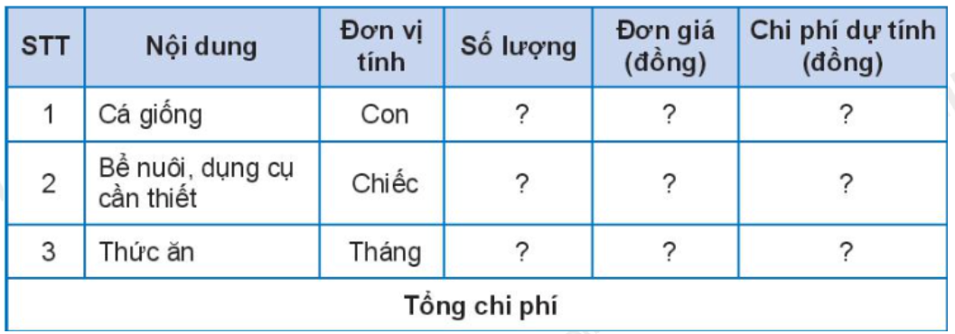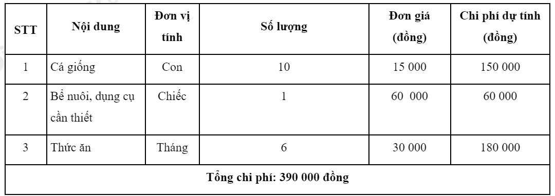 Dựa vào bảng trên, học sinh tự tính toán chi phí cần thiết để nuôi 10 con cá vàng trong 6 tháng đầu.