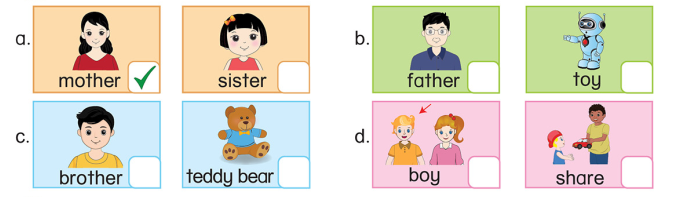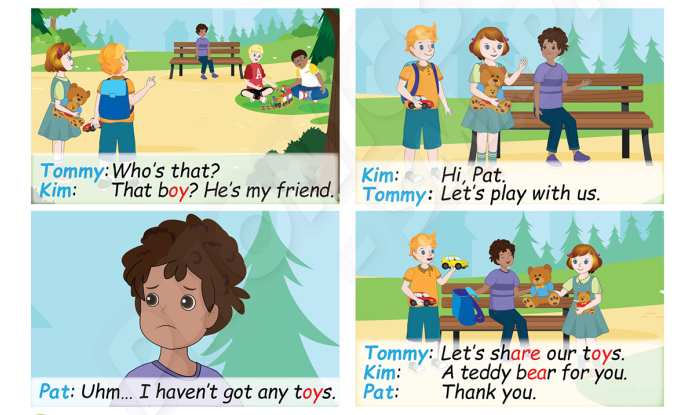 Tommy: Let’s share our toys. (Hãy cùng chia sẻ những món đồ chơi của chúng ta nào.)
