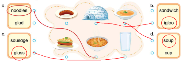 c. Sausage (xúc xích) – glass (cái cốc thủy tinh)