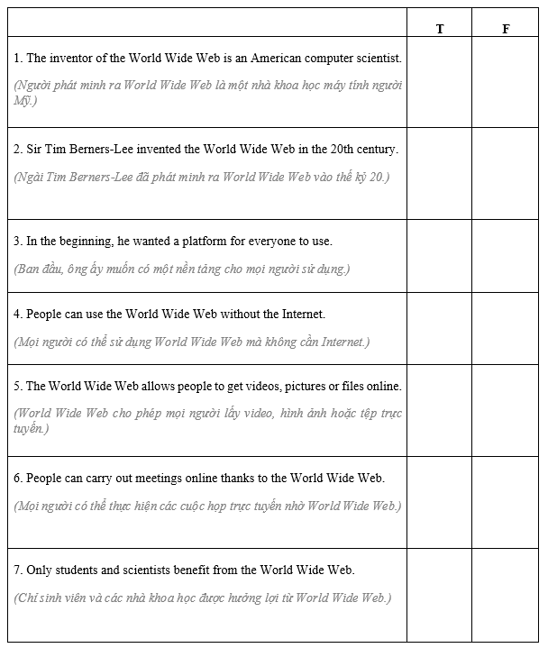 Thông tin: The World Wide Web allows people to get all kinds of information online. The information can be images, videos, or files.