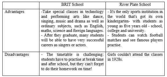 4. USE IT! Work in pairs. Make a list of the advantages and disadvantages of each school. Which school would you prefer to go to?
