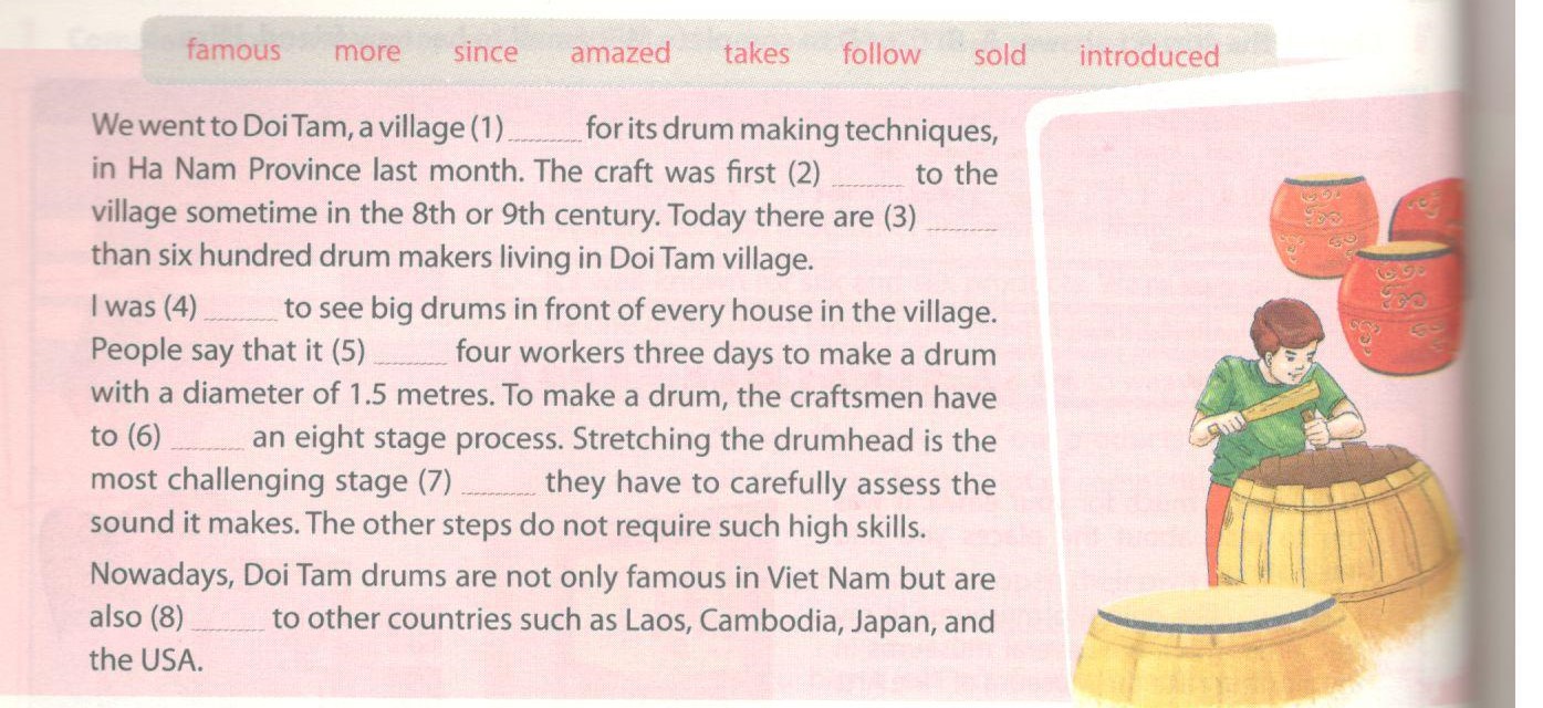 (Điền vào mỗi chỗ trống dưới đây với một từ thích hợp trong bảng để hoàn thành đoạn văn về Doi Tam-làng nghề làm trống.)