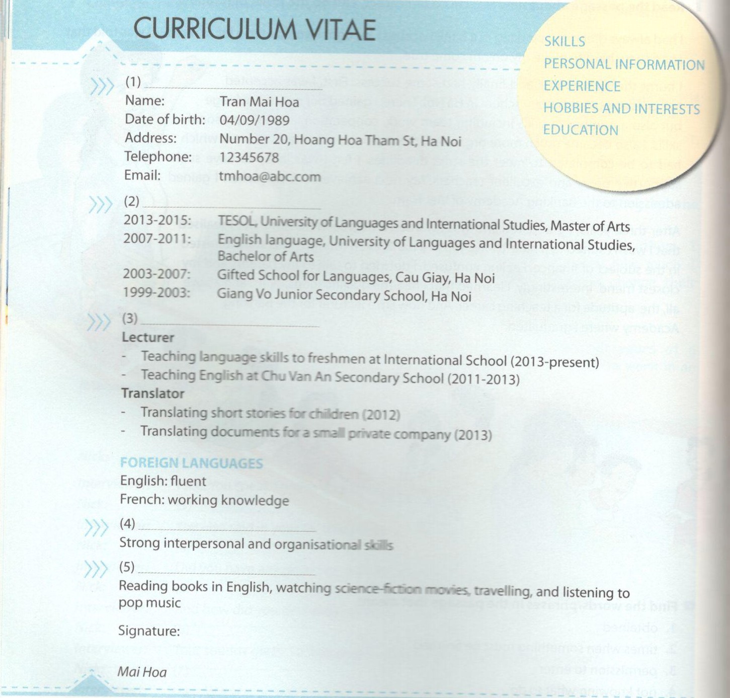 Đọc CV sau và nối các tiêu đề với đúng mục của nó.