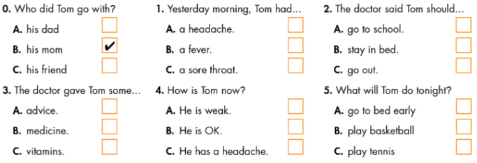 (Bạn sẽ nghe Tom nói chuyện vs bạn của anh ấy về chuyến đi tới bác sĩ. Mỗi câu hỏi, chọn câu trả lời đúng (A, B hoặc C). Bạn sẽ nghe hội thoại hai lần)