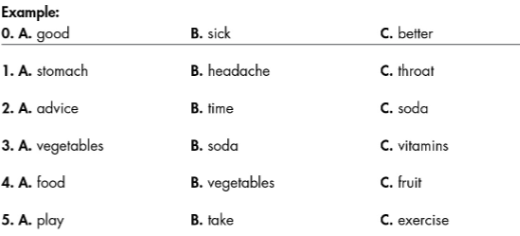 Tuần trước, tôi bị ho và đau họng. Tôi đã đến gặp bác sĩ và ông ấy đã cho tôi một số (2) lời khuyên để giữ sức khỏe. Anh ấy nói tôi không nên thức khuya. Anh ấy cũng nói tôi nên uống (3) vitamin và tập thể dục. Bác sĩ nói tôi không nên ăn nhiều (4) thức ăn nhanh. Anh ấy cho tôi một ít thuốc và bảo tôi (5) hãy uống. Bây giờ, tôi cảm thấy ổn trở lại. Tôi nghĩ rằng tôi sẽ làm theo lời khuyên của bác sĩ.