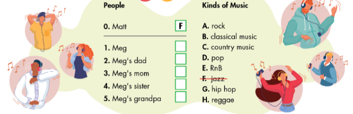 (Bạn sẽ nghe Meg nói chuyện với Matt về âm nhạc. Thể loại âm nhạc yêu thích của mỗi người là gì? Với câu hỏi 1 – 5, viết một chữ cái (A -H) bên cạnh mỗi người. Bạn sẽ nghe hội thoại hai lần)