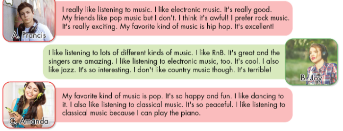 Part 1. You will hear Meg talking to Matt about music. What’s each person’s favorite kind of music? For question 1 -5 , write a letter (A – H) next to each person. You will hear the conversation twice. Part 2. Read the paragraph about the music three students like to listen to. Choose the correct answer (A, B or C)