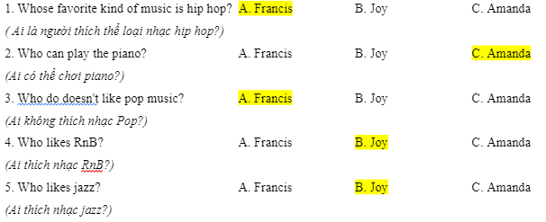 5. Who likes jazz?                                                   A. Francis       B. Joy       C. Amanda