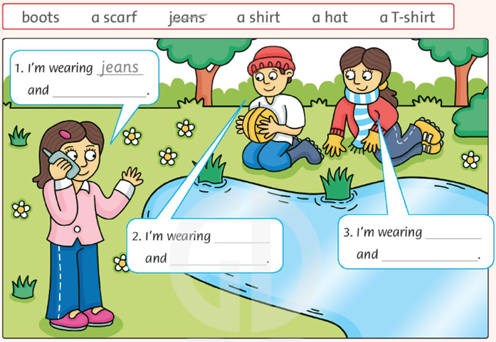 2. I’m wearing a hat and boots. (Tôi đang đội một chiếc mũ và đeo bốt.)