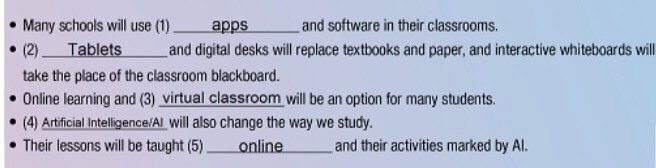 1. apps   2. Tablets   3. virtual classroom   4. Artificial Intelligence / AI   5. online
