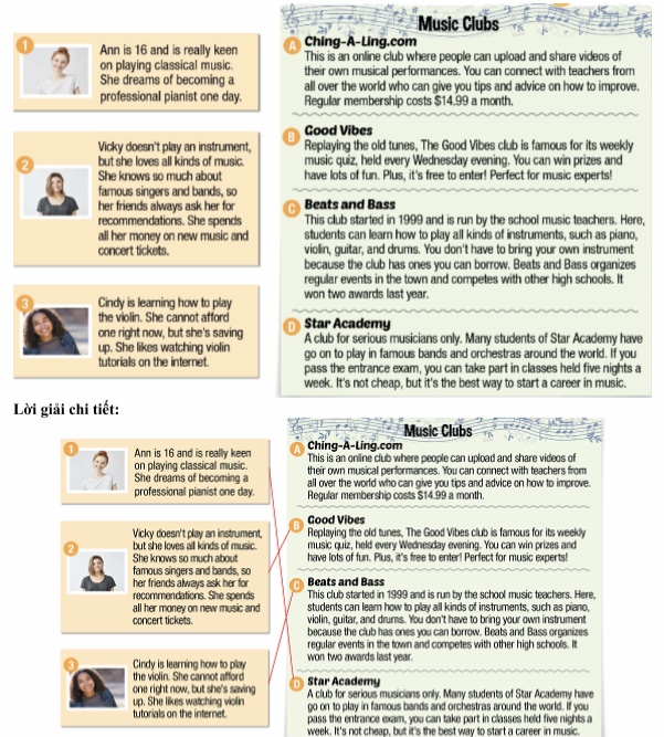 2. Vicky doesn’t play an instrument, but she loves all kinds of music. She knows so much about famous singers and bands, so her friends always ask her for recommendations. She spends all her money on new music and concert tickets. => B. Good Vibes: Replaying the old tunes, The Good Vibes club is famous for its weekly music quiz, held every Wednesday evening. You can win prizes and have lots of fun. Plus, it’s free to enter! Perfect for music experts!