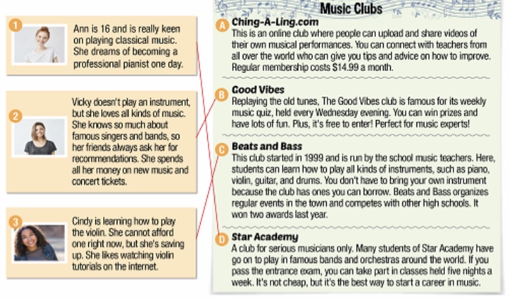 1. Ann is 16 and is really keen on playing classical music. She dreams of becoming a professional pianist one day. => D. Star Academy: A club for serious musicians only. Many students of Star Academy have go on to play in famous bands and orchestras around the world. If you pass the entrance exam, you can take part in classes held five nights a week. It’s not cheap, but it’s the best way to start a career in music.