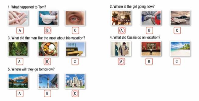 You will hear five short conversations. You will hear each conversation twice. There is one question for each conversation. For each question, choose the correct answer (A, B, or C).The people below are looking for a place to go for their next vacation. There are descriptions of four tourist destinations. Decide which place would be the most suitable for the people below.