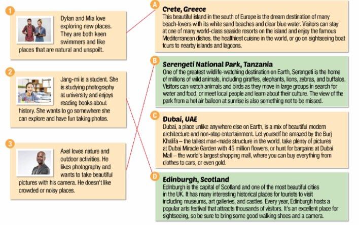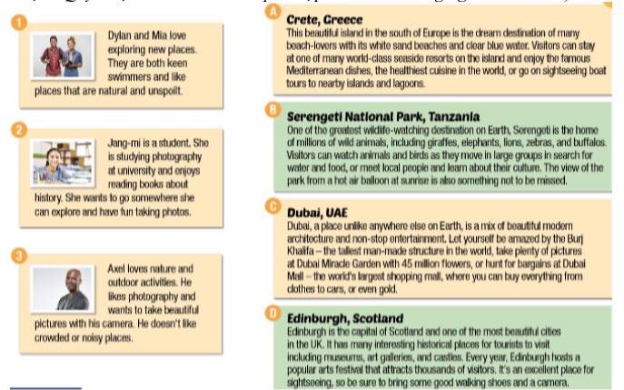 four tourist destinations. Decide which place would be the most suitable for the people below.