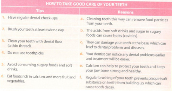 Task 1. Work with a partner. Match the tips with the reasons. Then practice asking and answering questions about the tips on how to take good care of your teeth.