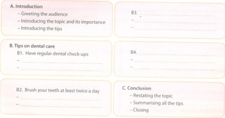 (Làm việc theo nhóm bốn người. Sử dụng thông tin trong phần 1 để chuẩn bị một bộ thẻ lưu ý để thảo luận về cách chăm sóc răng tốt. Thay phiên nhau trình bày bài nói chuyện của bạn với các thành viên trong nhóm của bạn.)