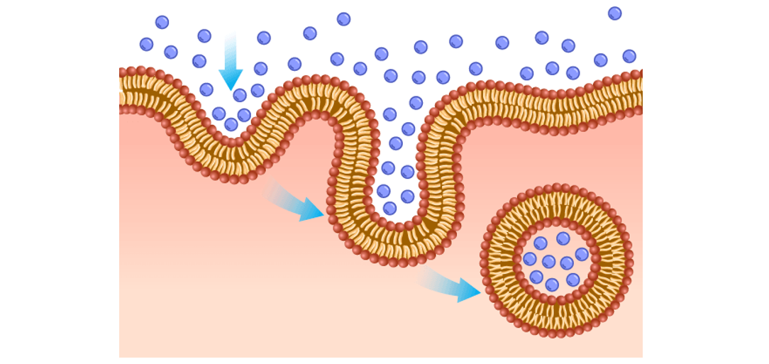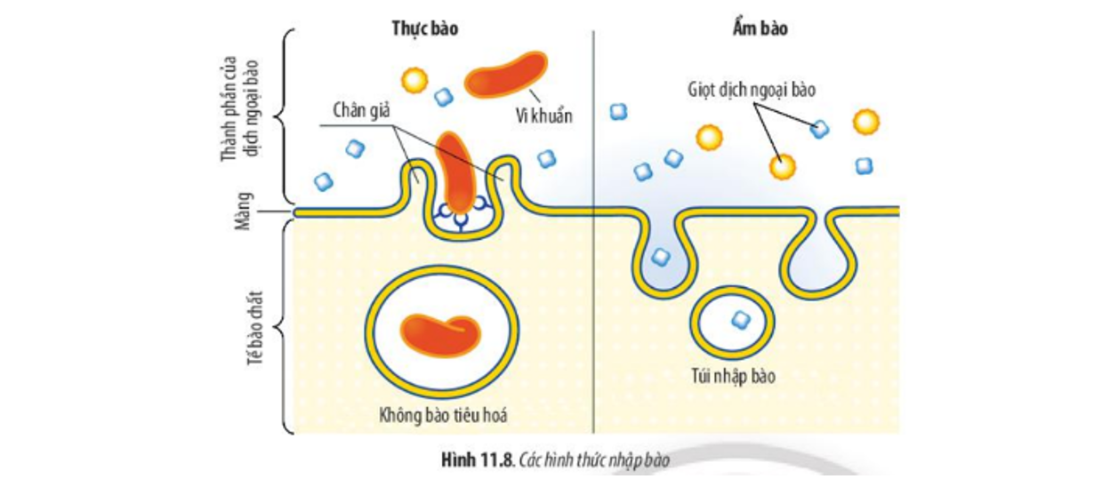 Tế bào lấy các phân tử có kích thước lớn, thậm chí là tế bào khác nhờ biến dạng màng tế bào tạo thành các túi tiết → Túi tiết tách khỏi màng và đi vào trong tế bào chất.