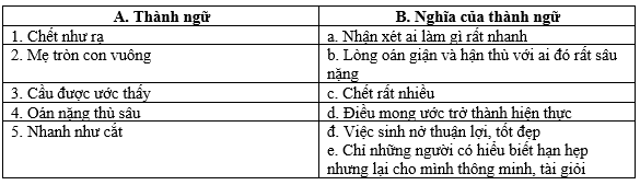 Tìm và ghép thành ngữ (cột A) với nghĩa của thành ngữ (cột B) trong bảng dưới đây sao cho phù hợp: