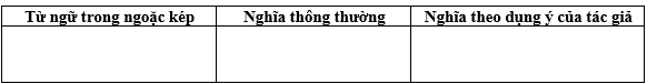 Tìm trong văn bản Tuổi thơ tôi các từ ngữ được đặt trong dấu ngoặc kép. Chỉ ra nghĩa thông thường và nghĩa theo dụng ý của tác giả bằng cách điền thông tin vào bảng sau: