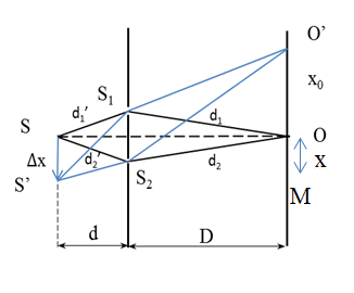 Khi dịch chuyển nguồn sáng theo phương song song với S1S2 thì vân trung tâm sẽ dịch chuyển một đoạn là: \({x_0} = \frac{{\Delta xD}}{d}\)