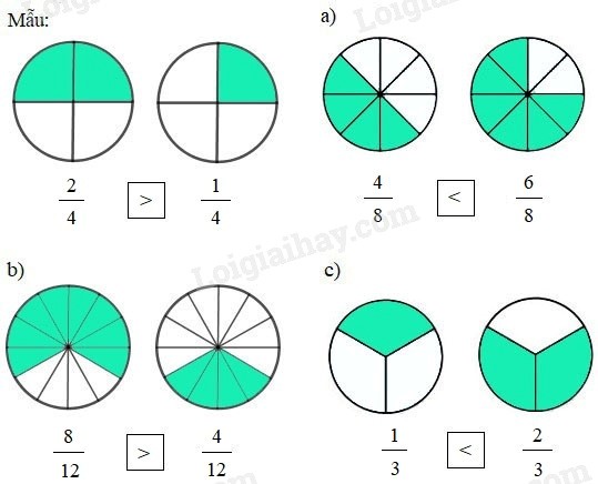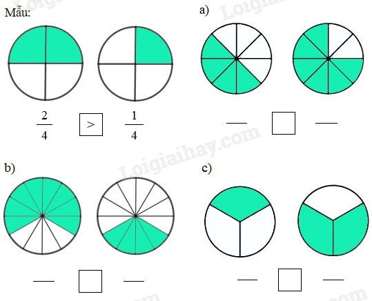 Đánh dấu vào ô trống dưới hình vẽ biểu diễn phân số bằng 1/3. Viết phân số rồi điền dấu (>; <; =) thích hợp (theo mẫu):