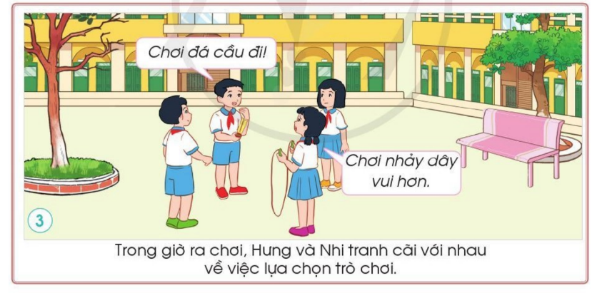 Tình huống 3: em sẽ khuyên hai bạn không nên cãi nhau vì mọi người có thể chia thời gian và chơi cả hai trò nhảy dây, đá cầu trong giờ ra chơi.