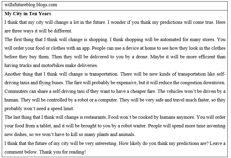 In my opinion, self-driving cars will definitely be common in twenty years. These cars can already drive on the highways around many cities. In less than ten years, they will probably even drive downtown. I think cars, trucks, and buses probably won’t be driven by humans in these areas. Commuters will share self-driving taxis with their family or neighbors. Maybe this will all be automated with an app on the latest devices. I think it will be great for commuters and it will reduce congestion in the city.