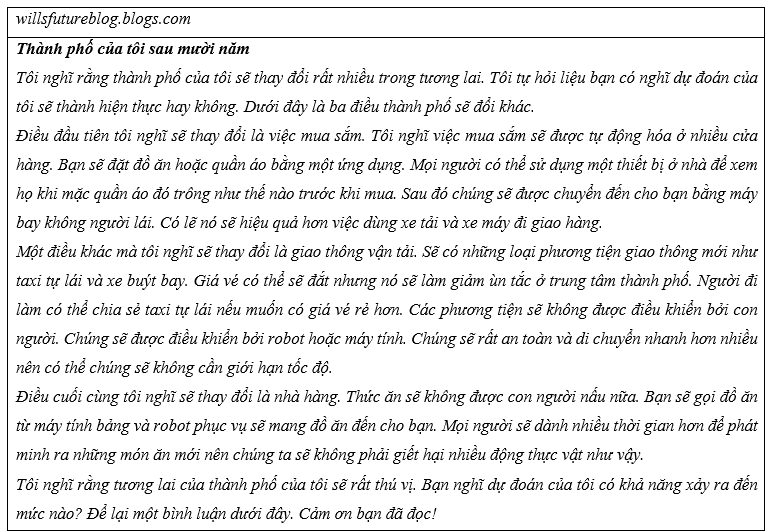 Theo ý kiến của tôi, xe ô tô tự lái chắc chắn sẽ phổ biến trong hai mươi năm nữa. Những chiếc xe này đã có thể chạy trên đường cao tốc quanh nhiều thành phố. Trong vòng chưa đầy mười năm nữa, họ có thể sẽ lái xe này vào trung tâm thành phố. Tôi nghĩ ô tô, xe tải và xe buýt có lẽ sẽ không được con người điều khiển ở những khu vực này. Những người đi làm sẽ chia sẻ taxi tự lái với gia đình hoặc hàng xóm của họ. Có thể tất cả điều này sẽ được tự động hóa bằng một ứng dụng trên các thiết bị mới nhất. Tôi nghĩ nó sẽ rất tốt cho người đi làm và sẽ giảm ùn tắc trong thành phố.