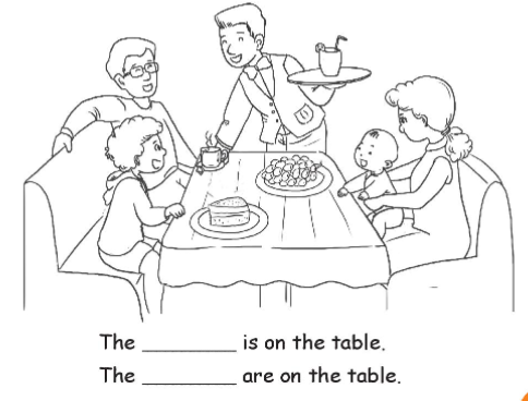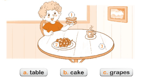 (Kế hoạch: Tìm và tô màu cái bánh, quả nho và cái bàn.  Nói cho các bạn của bạn nghe về những thứ có trong bức tranh.)