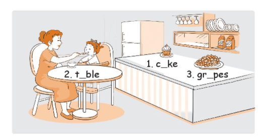 7. Project: Find and colour the cake, the grapes and the table. Talk with your friends about the things in the picture.