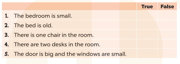 Complete and say. Do the puzzle. Look, write and read. Read and match. Make sentences. Point and say. Read and complete. Read and tick True or False. Look and write. Write about your bedroom.